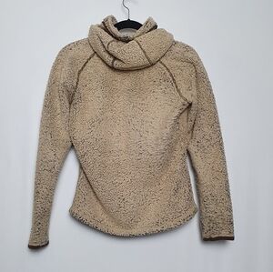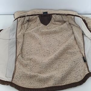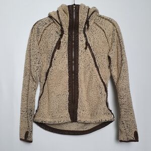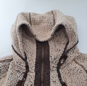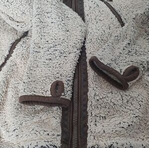 Features: 2-tone fleece, Flip-up hood zips away inside the collar, 2 zip hand and 2 zip chest pockets, Thumbholes secure sleeves over hands for warmth, Faux-leather trim; flatlock stitching, hooded
