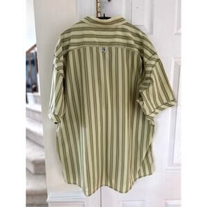 Excellent condition.. Eluxur style green, grey, and cream stripe short sleeve button down shirt. Performance fabric. Asymmetric front pocket.