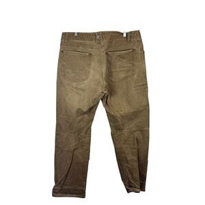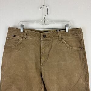 Tan color, zip fly with button closure, relaxed fit, durable cotton stretch, size 38x32.