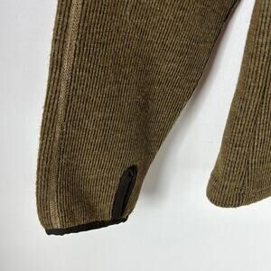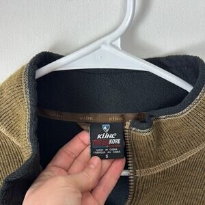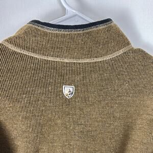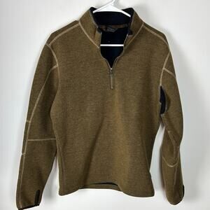 Gently Used Kuhl ThermoKore Quarter Zip Sweater. This is a men's small. Brown / green color throughout. Vertical ribbing. Accents on the seams. Tan Kuhl logo on the shoulder and upper back. Thumb holes on the wrists. Fleece lined. 63% polyester, 23% wool, 4% PU (thinking polyurethane).
