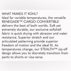Kuhl Renegade Convertible Stealth Patented Zip Off System Pants in Khaki - 40x34 in excellent like new condition. No signs of wear. The best pants! See all photos for the details.