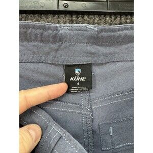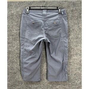 Kuhl Trekr Kapri Capri Pants Womens 4 Blue Stretch Ruched Hem Hiking Outdoor. Color is blue with slight gray undertones. Gently used; inner drawstring is missing. Sides can be ruched if desired. Measurements in photos. Fast shipping!