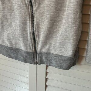 Kuhl women's sweatshirt, size small. Cotton blend. Heathered light grey color with slightly darker trim (color is most accurate in photos of actual item). Asymmetrical zip in front, full zip. Style name is Arva. Hooded. Logo on sleeve. Gently worn, in very good used condition. A loose thread in one spot, see close-up photos. No rips or stains.