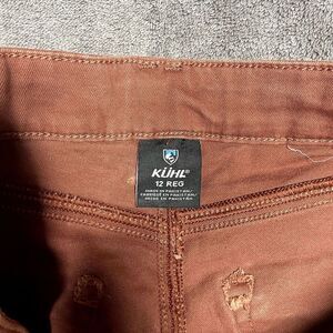 Reposhing this item I purchased from @secondhandgood. Loved it, super high quality, wish it fit, groovy color but they are SKINNY tight. Size 12 fits more like a size 10 skinny. Kuhl is such a great brand and I don't think they shrunk, I have another pair similar but not this skinny on the thighs. They are more of a wine/burgundy rust color.