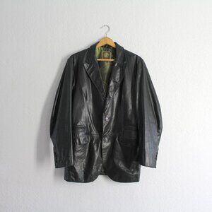 KUHLMAN elegant men's leather black jacket. Two-button, double vented back, satin green/paisley lining, pockets.
