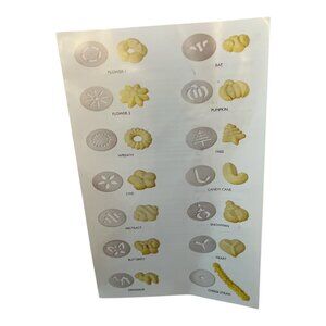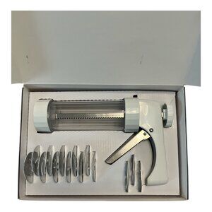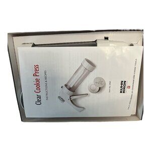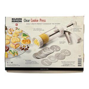 Bake like a pro with this Kuhn Rikon Clear Cookie Press, designed in Switzerland for easy, consistent cookie shapes. This set appears unused and includes 14 interchangeable stainless steel disks with seasonal and everyday designs like hearts, stars, snowmen, trees, and more. Comes with the original box and instruction booklet featuring recipes.
