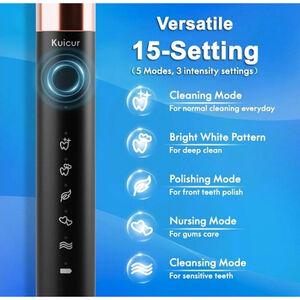 Advanced electric toothbrush with multiple brush heads. Features a sleek black design. Includes a travel case for convenience.