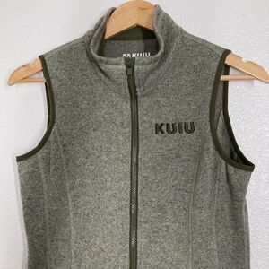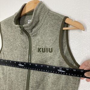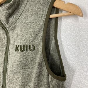 Details: Sleeveless zip-front vest, zip hand pockets, contrast binding at armholes and hem, embroidered KUIU logo on left chest, ram head logo on upper back.