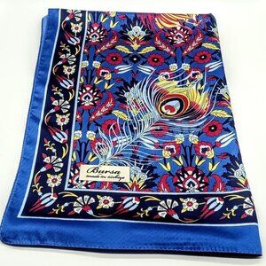 Extra-wide pure Kule silk scarf/wrap from Bursa, Turkiye in a rich blue, red and yellow peacock feather and floral print.