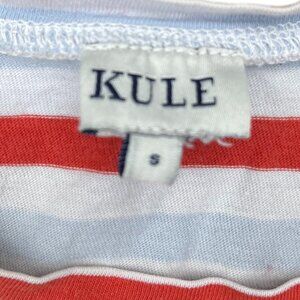 Add a pop of color to your wardrobe with this stylish Kule striped t-shirt in a vibrant red, light blue, and white pattern. This women's size small t-shirt is perfect for casual outings or lounging at home. The used shirt has some small markings, as shown in the photos. The classic striped pattern is timeless and versatile, making it easy to pair with jeans, shorts, or a skirt for a chic and effortless look. Don't miss out on adding this stylish and comfortable t-shirt to your collection!