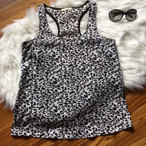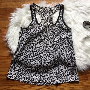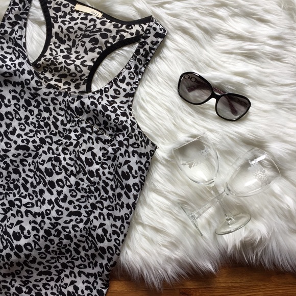 This Silky racerback shell features a black cheetah print on a white background with zippertooth trim around neckline and armholes.