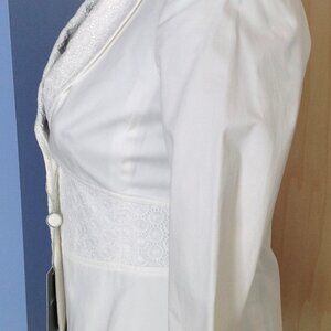 This white cotton and lace fitted blazer is from Kulson. It is new with its original $640 price tag. The collar, lapels and waistline are white lace. It has a two-button front closure. It was made in the USA and is a size 38 (size 2). It is 98% cotton and 2% elastane. The sleeve edges roll/cuff up. It is fully lined.
