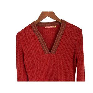 This textured alpaca wool sweater offers warmth and style in a vibrant red hue. The brown trim and V-neck design add a touch of elegance.