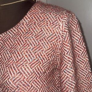 Gorgeous cross hatch pattern in red, orange & blue with a cream base