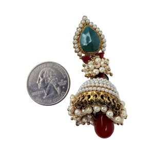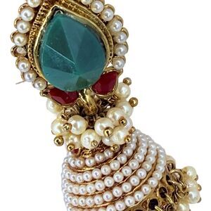 * These stunning handcrafted earrings feature a classic Indian Jhumka design with elegant detailing. Adorned with green rhinestones, white imitation pearls, and a red glass dangle bead, they are perfect for weddings, festive occasions, or vintage jewelry collectors.