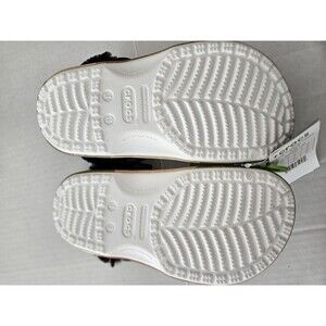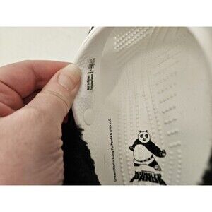 These are white Crocs sandals featuring a Kung Fu Panda design, with a fuzzy back for added comfort. They are a unisex style in kids' size J3, perfect for casual wear or travel. The slip-on design and lightweight croslite material provide breathability and cushioning, while the non-slip outsole and arch support ensure stability and comfort for little feet. Perfect for a trip to Universal.