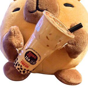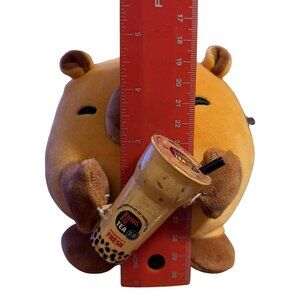 This adorable Kung Fu Tea collectible plush from ZURU (2024) features a squishy brown bear holding a miniature Kung Fu Tea cup. The cup feels like metal or hard plastic (not fabric) with a printed logo and attached straw. It's permanently affixed to the bear’s paws with strong or thicker, corded thread, for a fun, realistic look.