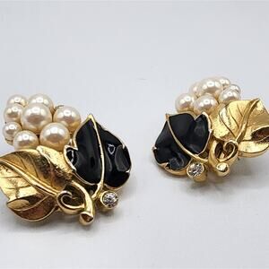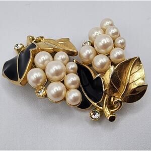 Kunio Matsumoto Grape Cluster Clip Earring Crown Trifari Black Enamel Faux Pearl