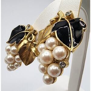 Signed Crown Trifari & Kunio Matsumoto from the 1970s, these beautiful and sought after clip on earrings feature faux pearl grapes on the vine with black enamel leaves. They are gold tone and have some sparkle from scattered rhinestone accents. The condition is Very Good with no notable flaws. They each measure just under 1.5 inches long by just over 1 inch wide.