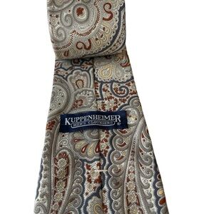 Kuppenheimer Men’s Clothier Paisley Tie Made in USA tie 3 1/2 wide 59 inches. This tie is made if all silk from Italy. It has blue, burgundy and tan colors. It is in great condition.