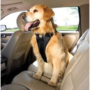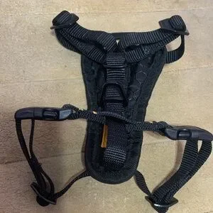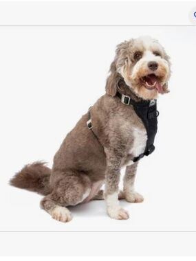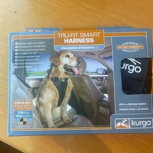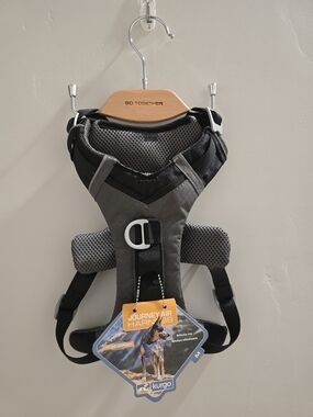 Sturdy Kurgo harness in black with yellow accents. Ideal for walks and adventures. Has a front and back hook for leash. Used once, dog outgrew it.