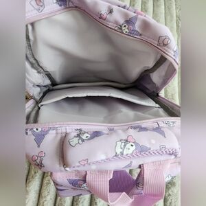 The backpack is primarily lavender with a lighter purple front pocket. It is adorned with various small illustrations of Kuromi.