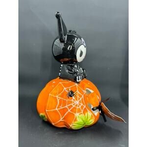 This Kuromi on Pumpkin T-Light Holder is the perfect addition to your Halloween decor. The black figurine features a cute kitty sitting on top of a pumpkin, with a T-Light candle inside. The intricate pattern of the pumpkin and theBlue Sky brand make this a unique collectible. Use it as a table centerpiece or hang it from your tree to add a spooky touch to your holiday festivities. This figurine is perfect for any Halloween occasion and will surely delight collectors and fans alike.