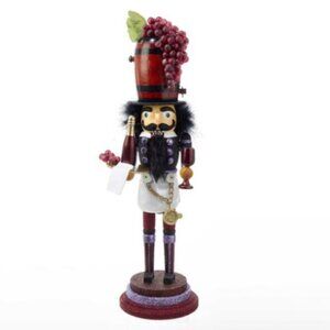 Brand new, in original box.Kurt Adler Wine Nutcracker designed by Holly Adler and is part of the Kurt Adler Hollywood Nutcracker Collection. His hat is a wine barrel, his outfit has a wine-colored theme. He is holding a serving tray with purple grapes, a bottle of red wine, and a napkin, and in the other hand a purple wine glass. It has not been removed from the box or unpacked, it is still in its plastic wrap.