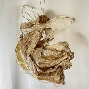 • Features: Glitter wire wings, layered metallic ribbon gown, pearl flower accent