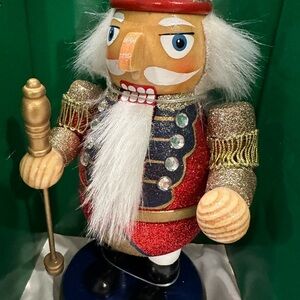 This hand-painted wooden nutcracker features intricate details, a majestic crown, and a kingly staff. A charming addition to holiday decor.