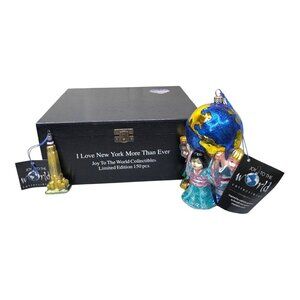 Add a unique touch to your holiday decor with these limited edition Joy To The World ornaments. The set includes a gold rocket and a globe ornament, each with intricate details, embodying a message of unity and celebration. Ideal for collectors, these pieces come with a secure display box.