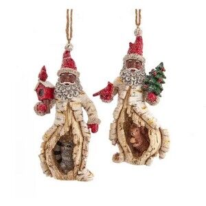 Birch Berry African American Santa With Animal Ornaments, 2 Assorted Simply beautiful Resin and glitter diorama style ornaments Features natures wildlife Assorted Raccoon and Squirrel 5.25 inches high New with tag and jute hanger Very collectible