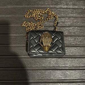Elegant quilted design. Features gold chain strap. Iconic emblem detail.