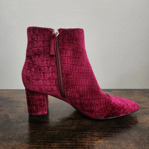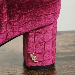 The Burlington Ankle Boots feature a burgundy wine colored croc print effect across the shoe. The block heel features a gold KGL stud detail. Soft velvet feel