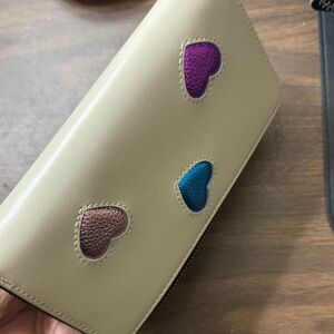 Chic cream wallet adorned with vibrant heart accents. Features yellow, pink, blue, and green hearts. Stylish and playful design.