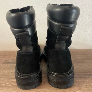 Black suede Rainbow Bobby ankle boots from Kurt Geiger London featuring round toe, rhinestone embellishment, front zip fastening, padded ankle, pull-tab at the heel and chunky rubber lug sole. These are a size 36, which translates to a US 6 (see attached Kurt Geiger size chart).