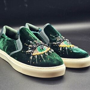 Step out in style with these luxurious green velvet slip-on sneakers from Kurt Geiger. Featuring a unique eye embellishment, these shoes are perfect for adding a touch of elegance to any outfit.