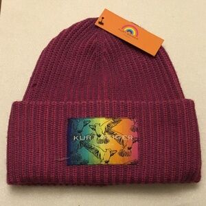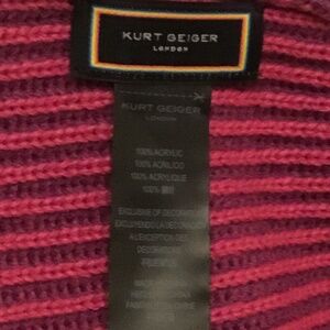 This Kurt Geiger hat is done in a two—tone striped, or rib, knit that is a deep pink/fuschia and lavender/purple. It is made of acrylic and is warm and comfortable. The hat has a 4” cuff with a large, multicolored “patch” label that has the Geiger name and birds (doves, maybe? ) in the background. It is approx. 9” from the top of the hat to the bottom of the cuff, and it is approx. 9 1/4” across the bottom of the cuff (so 18 1/2” all around).
