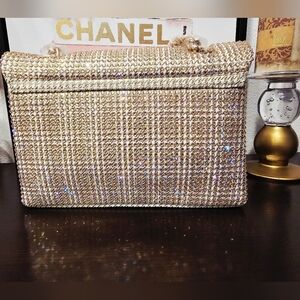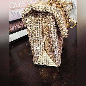 NWT. Kurt Geiger London Brixton Lock Shoulder bag, This elegant gold bag features a stylish chain handle, perfect for any occasion. Its shimmering design adds a touch of luxury to your outfit.