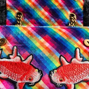 The colorful bag from Kurt Geiger London is a soft rainbow check velvet fabric with embroidered koi and flowers. It has a 10 or 18" drop from the heavy brass chain. The flap is edged with a heavy, black cotton fringe and the signature brass bird head adorns the front It closes with two magnetic clasps and has a divided pocket inside. It measures 6" tall x 10" wide and 3" deep. It has a hard bottom.