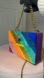 The Kensington Bag Clutch is made from a structured perspex showcasing the iconic diagonal rainbow. The antiqued brass Eagle head features rainbow coloured crystals and black bead eyes on the front flap.