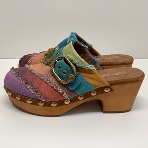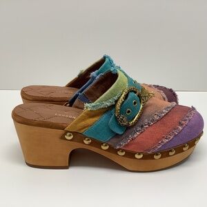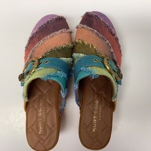 These Kurt Geiger London Mayfair Clog, otherwise known as the Mayfair Rainbow Frayed Denim Patchwork Buckle Hardware Strap Platform Clogs, are in Excellent used condition, like new! They are size EU 39, which equates to an approximate 8.5 US.