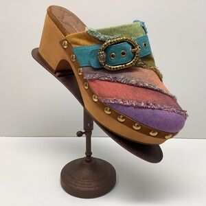 • Design: The clog features multi-colored, frayed denim patchwork stripes with a blue strap that has a large antiqued brass buckle. The buckle is embellished with an eagle head and crystals.