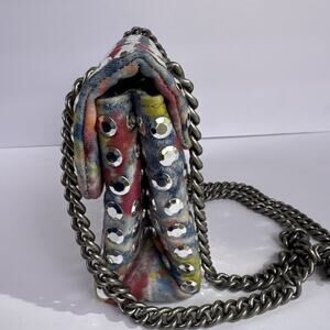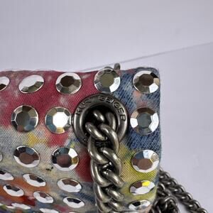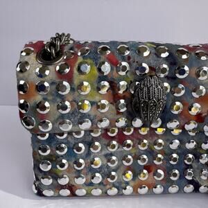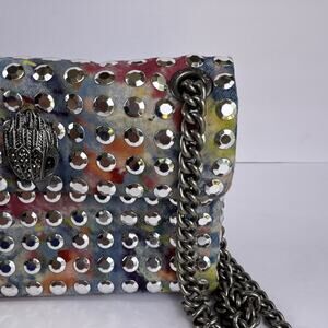 Authentic Kurt Geiger London Micro Kensington bag featuring multicolor rainbow stud design, antique-silver chain strap, dust bag and signature eagle-head clasp. Compact crossbody or shoulder style. Excellent condition with minimal signs of wear. Approx. 6”W × 4”H × 2”D. Please see all photos for condition. Thank you!