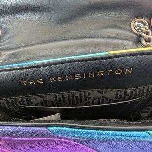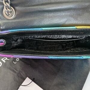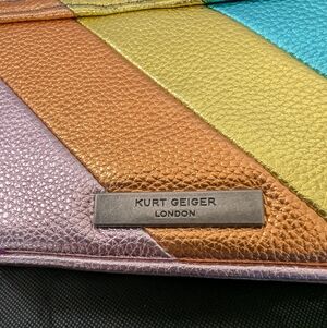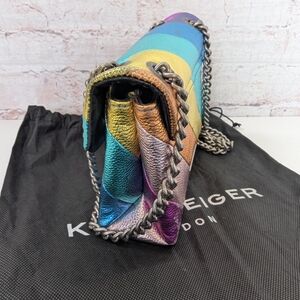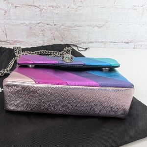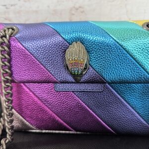 Kurt Geiger London Mini Kensington Metallic Rainbow Striped Crossbody Bag. This popular handbag features rainbow-hued diagonal stripes, a metallic leather finish, and the brand's signature crystal-embellished eagle head emblem.