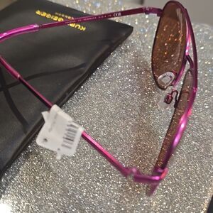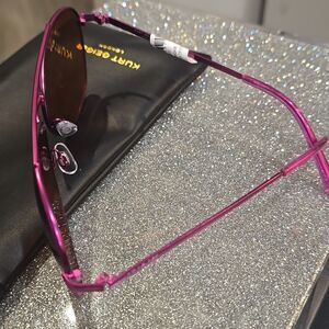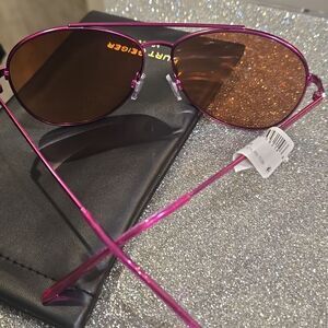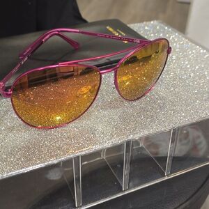 Stylish aviator sunglasses with pink frames and orange lenses. Perfect for a bold look.