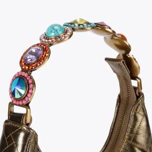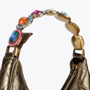 The Small Octavia Drench Moon Purse is crafted from a metallic bronze leather alternative with a black eagle head on the front of the bag. The strap is topped with oversized resin stones and crystals.