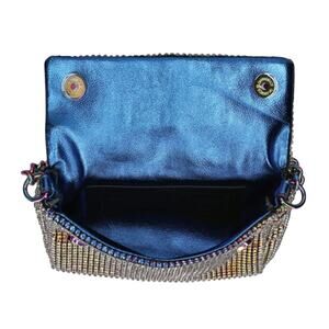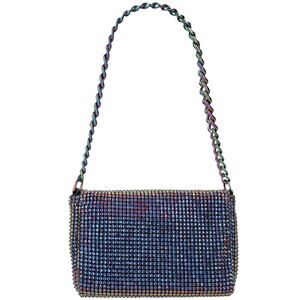 A crystal-encrusted eagle head and sparkling embellishments shimmer and shine on a lustrous shoulder bag fitted with a chain-link strap for party-ready appeal.