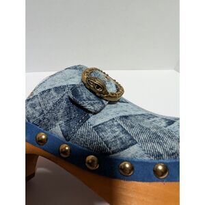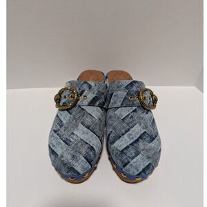 New without tags Kurt Geiger London Mayfair denim platform clogs. Featuring a chunky wooden heel, denim upper, stud detailing, and the signature eagle head buckle. Heel is approximately 2.5" tall. These are European size 39, which converts to a US size 8.5.
