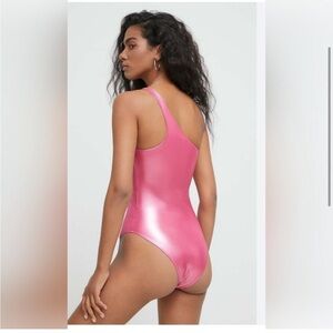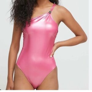 Kurt Geiger London kensington pink fuchsia metallic iridescent mermaid One Piece one shoulder brass eagle clasp detail Swimsuit size XL new